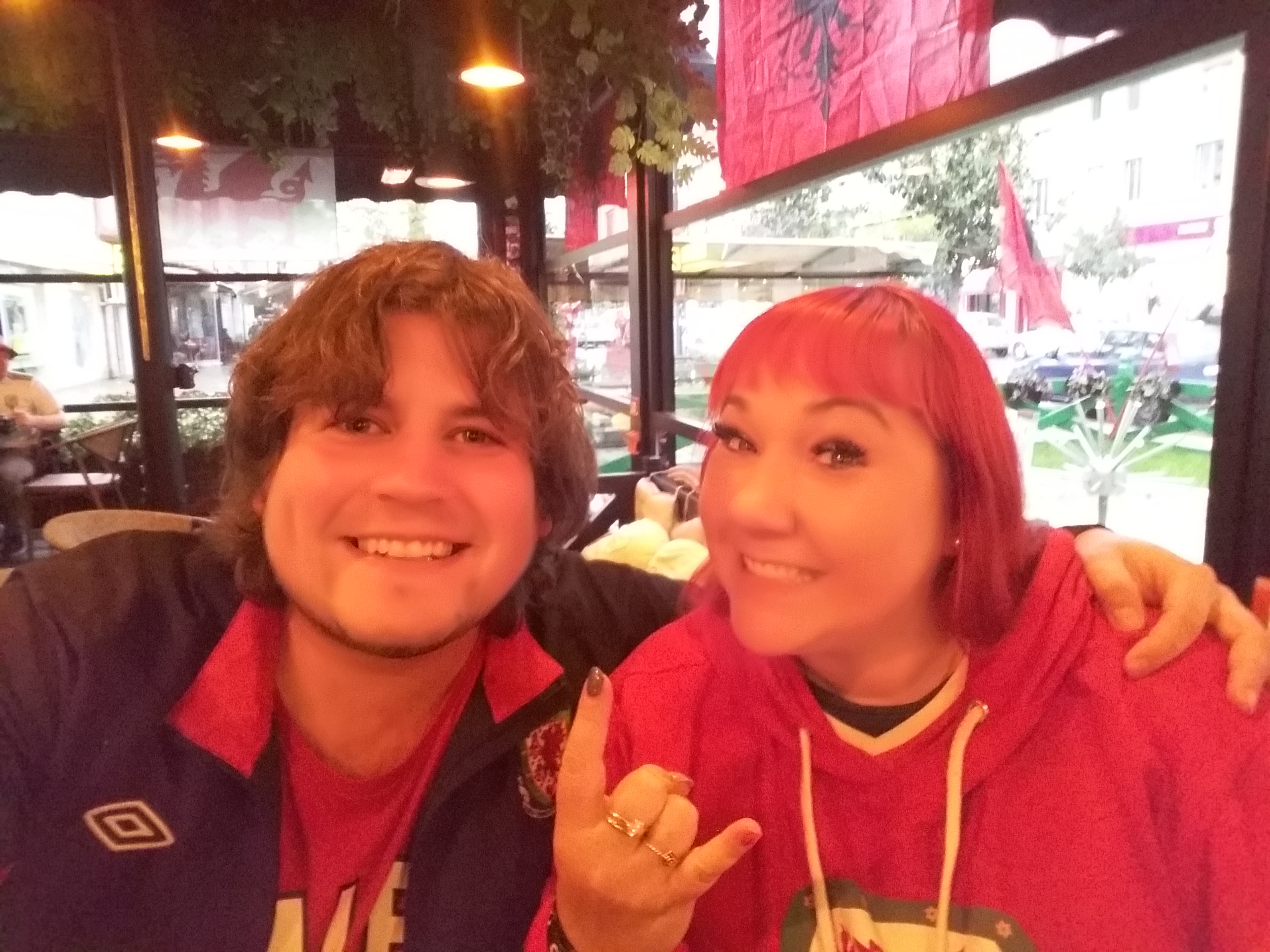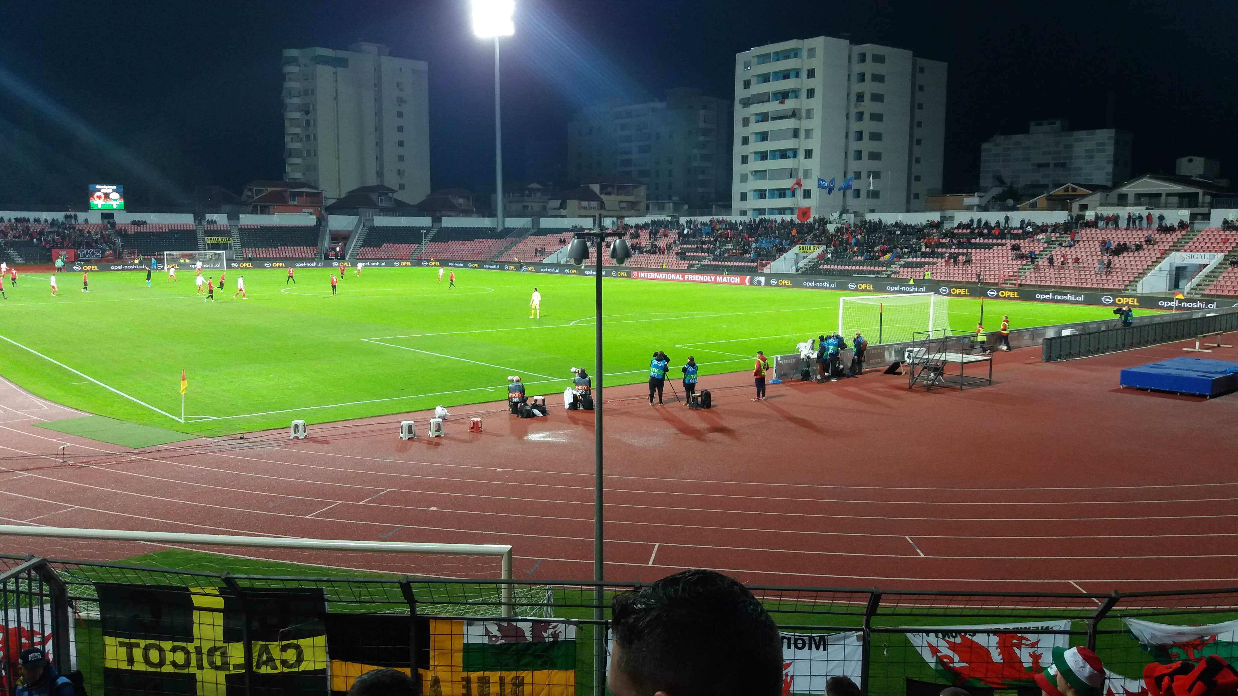 Although I do have solid experience of staying in pubs for 9 hours, it certainly helped when after lunch the majority of the Welsh contingent arrived on buses from Tirana, including my life-long friend and County fan Donna arrived as Peter went back to the hotel for a siesta. It didn’t take too long at this point for the pub to start bursting in to song, aided immeasurably by a cocktail of… cocktails, and wine once I got fed up of the beer. By the time Peter returned we were hassled to start walking to the ground and we arrived minutes before the anthem sounded.