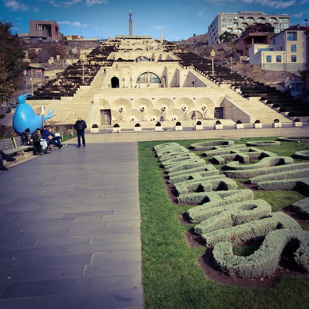 Still going in a quite linear direction we approached the Yerevan cascade, undoubtedly the tourism focal point of the city. The Cascade, or staircase to you and me, consists of 5 hillside terraces connected with 572 steps, 302 meters high. I say building, as under the steps there are areas for exhibitions and cafes. There is also an escalator that will take you up to near the top. Peter was grateful for this, whilst I chose to drag my fat arse up the steps (my foot hasn’t been the same since, a month later).
