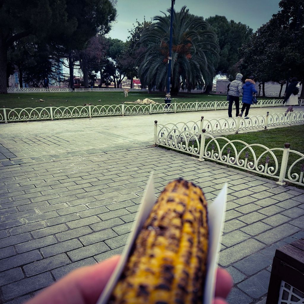 After finding a stable place to re-shoe-up, it was time for a recovery sit down, one of about seven thousand today. The benefit on this occasion was a mid morning snack featuring a 50p cob of sweetcorn with salt. I miss them already.