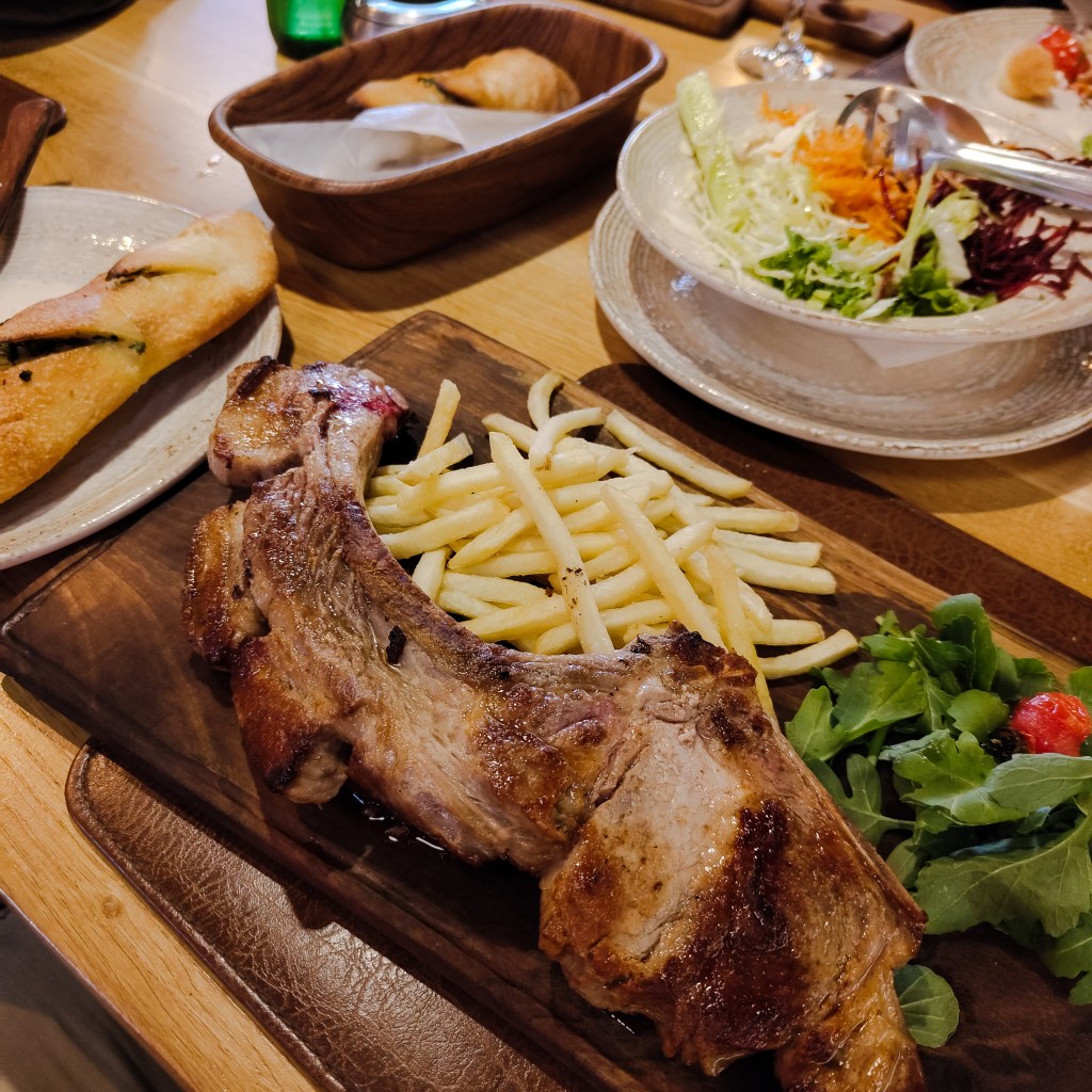 A T-bone pork joint with fries, salad, garlic bread and a drink came to about 16 quid. Just look at the size of it….