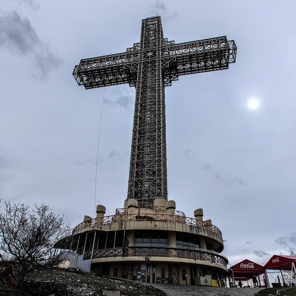 Built in 2002, at 66 metres high, the cross is one of the largest of it’s kind in the word according to Wikipedia. What that doesn’t tell you is that you can actually see the cross lit up from as far away as the Kosovo border some 20 plus kilometres away. You’ll see a really shit photo as proof if you keep scrolling to tomorrow…