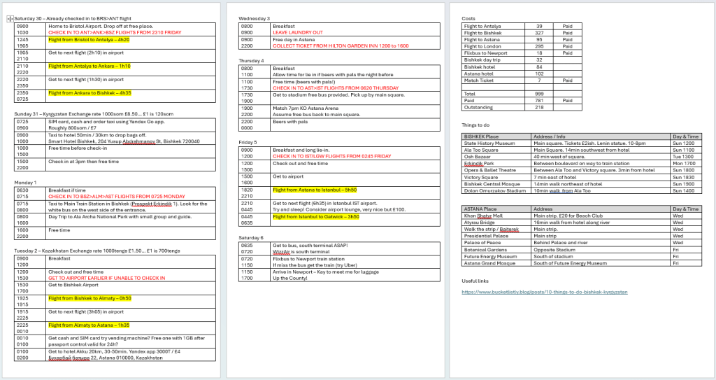 To give you an idea of how much bloody effort goes into such a trip, I’ve included my itinerary document below! I tend to do these for all trips and seldom refer to them on the trip itself, but this one was vital with 7 flights and 3 foreign currencies!
