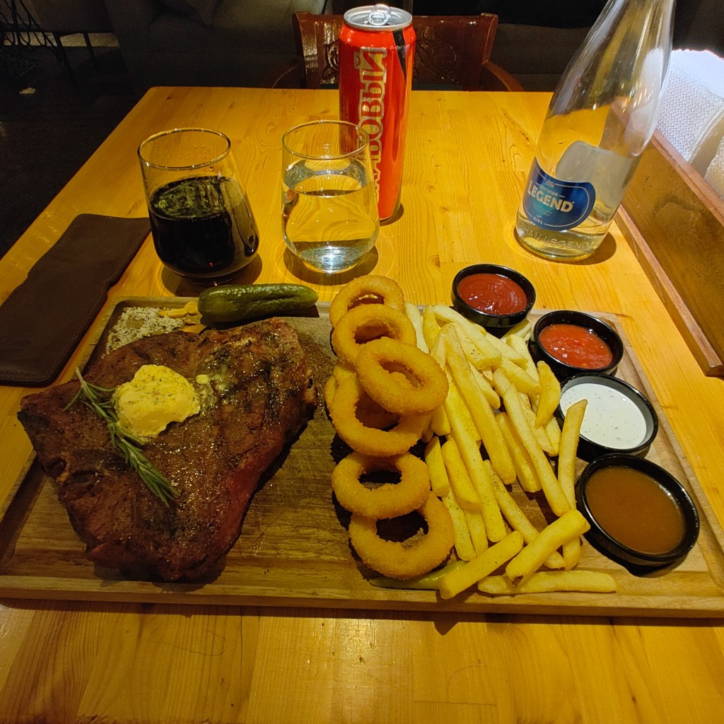 A T-bone pork joint with fries, salad, garlic bread and a drink came to about 16 quid. Just look at the size of it….
