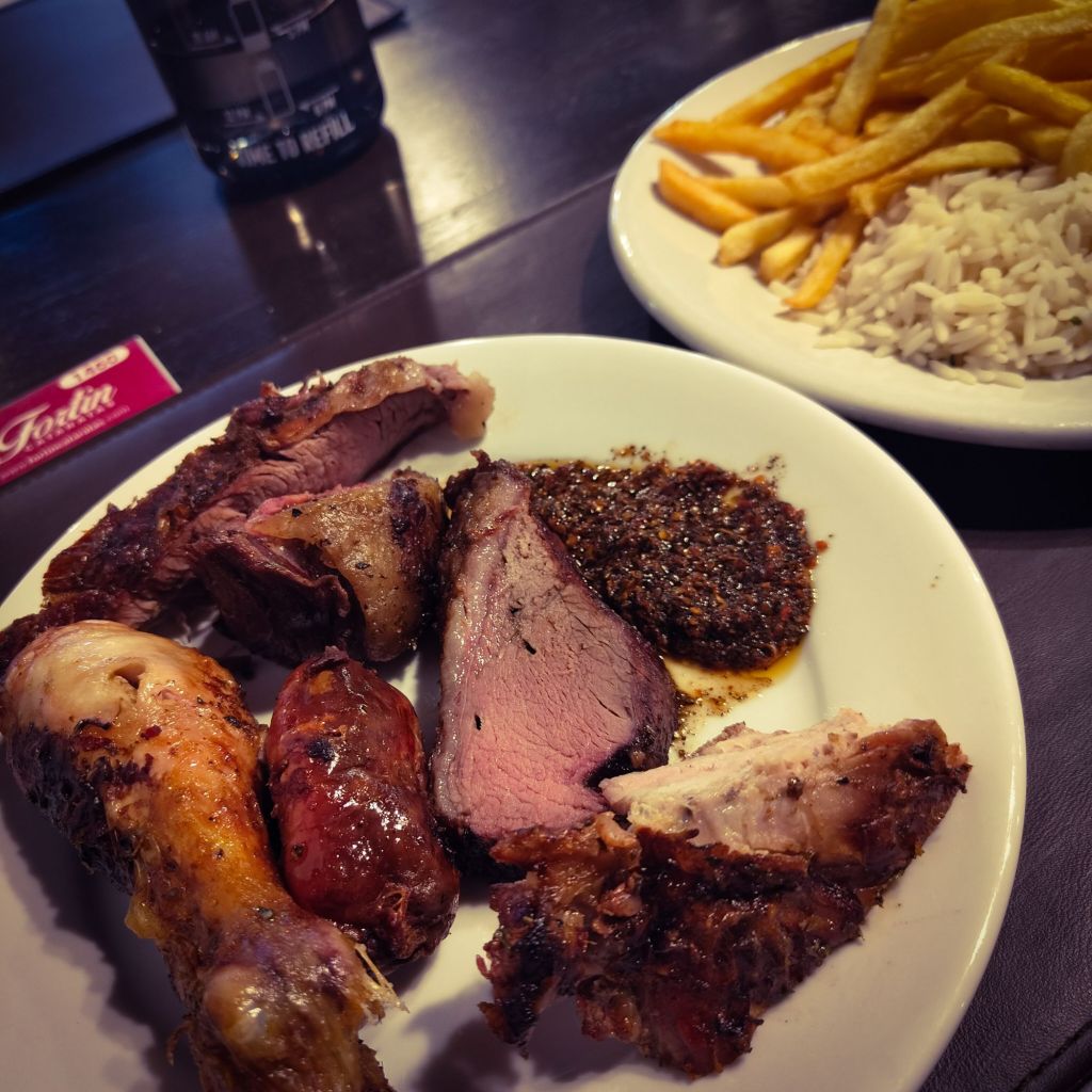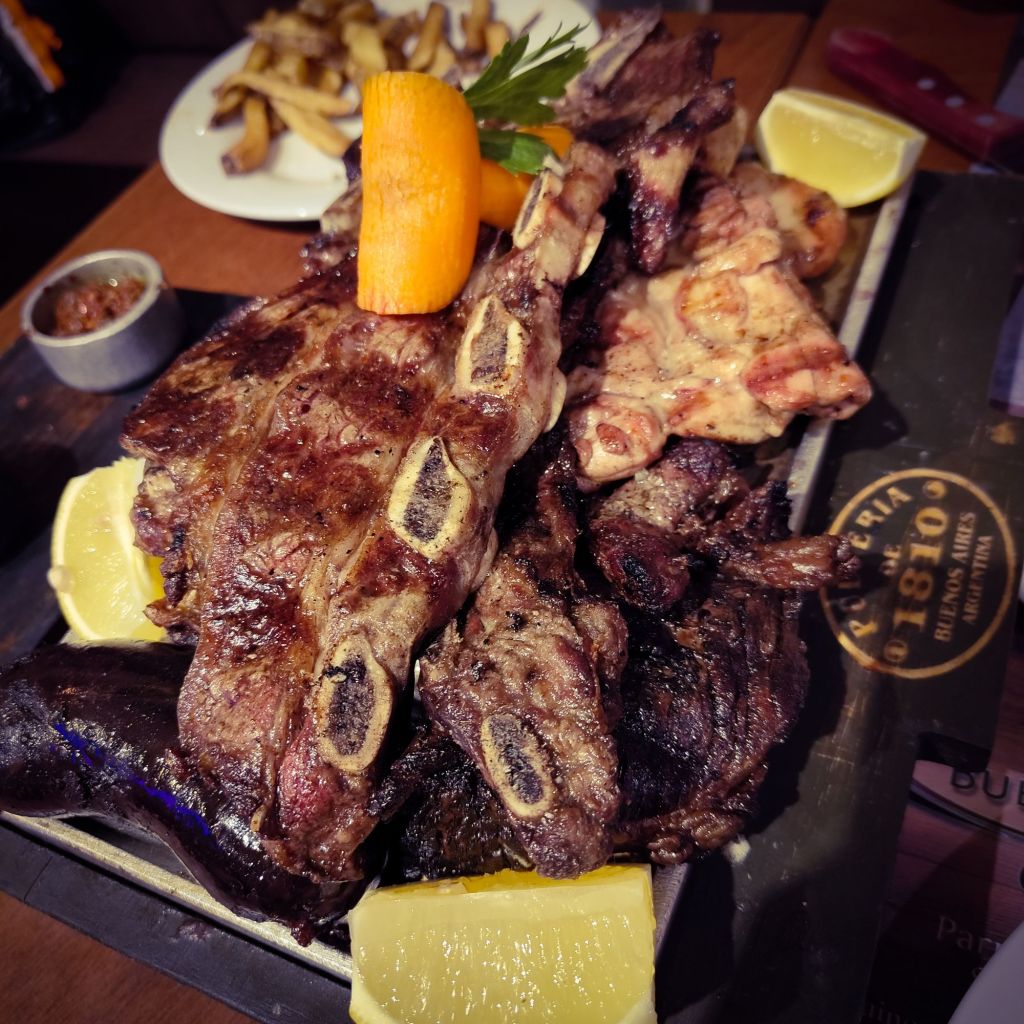 We found somewhere on Google Maps within a five minute walk, experiencing the broadway-style street along the way showing several theatrical and comedy shows. The food itself we agreed was the best of the whole trip, a humungous meat platter with sides of fries, rice, bread, salad and chimichurri. It was absolutely devoured apart from the blood sausage (a way too soggy black pudding) and chicken hearts, which the texture was… just urgh. For £45 including drinks, being so central too, we were very satisfied.