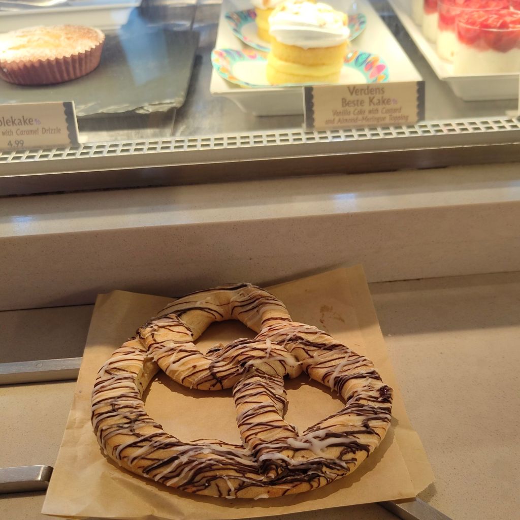 Thoughts: Decent size and the chocolate topping and raisins went some way to make it more interesting than your standard pretzel. Enough to share.