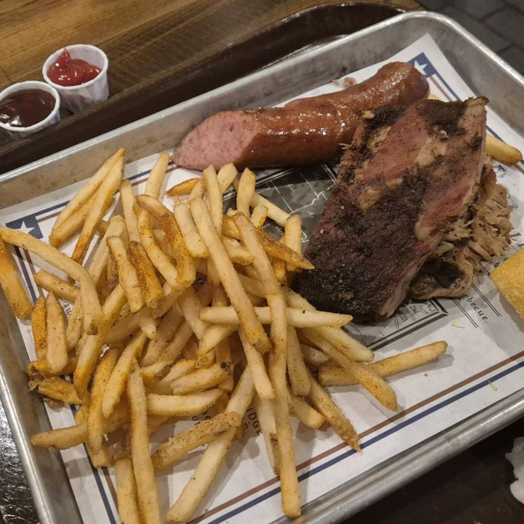 BBQ Platter – Memphis dry-rubbed pork ribs, North Carolina chopped smoked pork butt, and smoked sausage served with cornbread and fries.