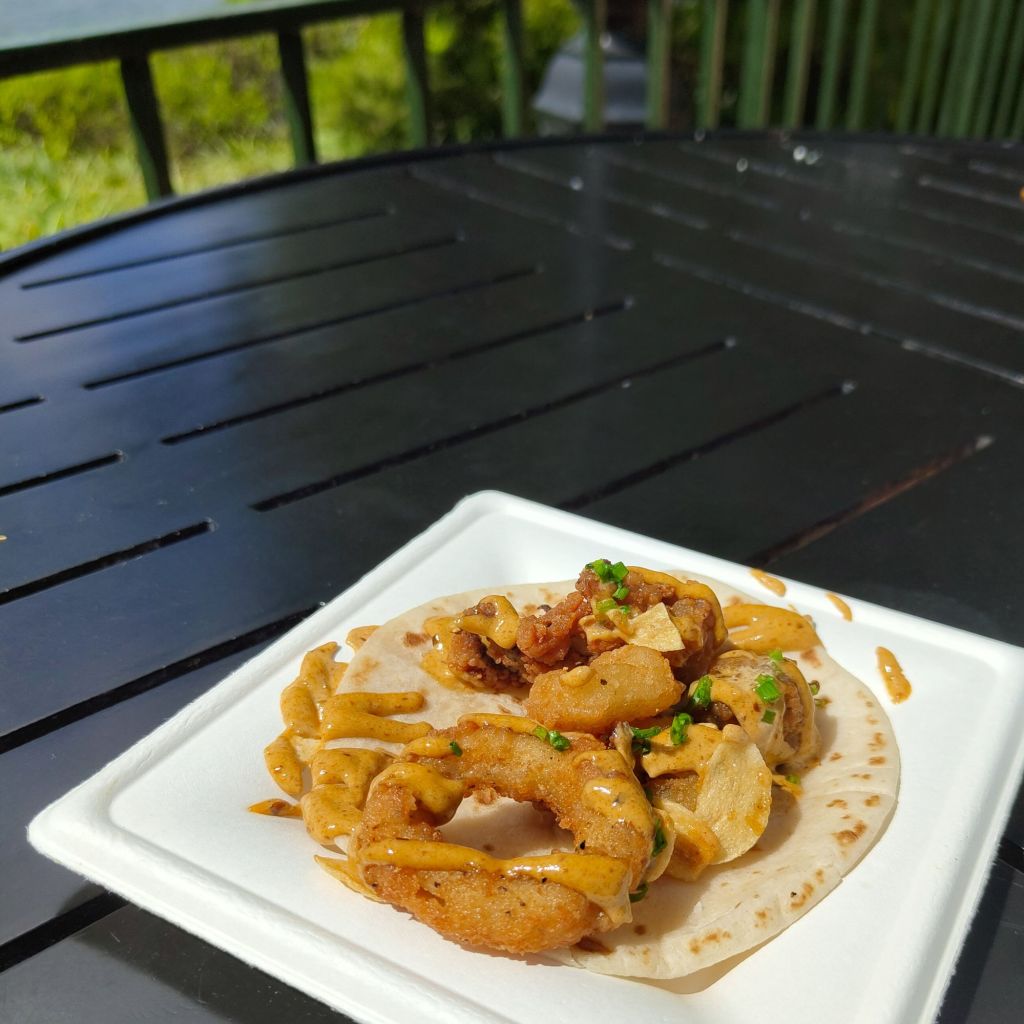 Taco de calamar – Crispy calamari, fried garlic, pasilla aioli, and chives in a flour tortilla.